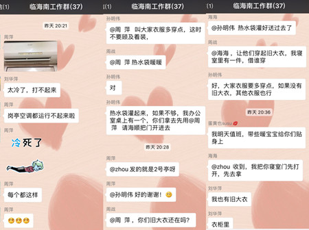 “太冷了,崗?fù)た照{(diào)全都運行不起來了。” “每個崗?fù)ざ家粯印!?/span> “冷死啦!” “修空調(diào)的師傅來了,檢查了一下,他說這個沒辦法,是因為天氣太冷的原因,并不是壞了。” “大家衣服趕緊多穿點,誰有舊的工作大衣。” “熱水袋灌起來,不夠,我的拿去先用。” “我也有舊大衣。”