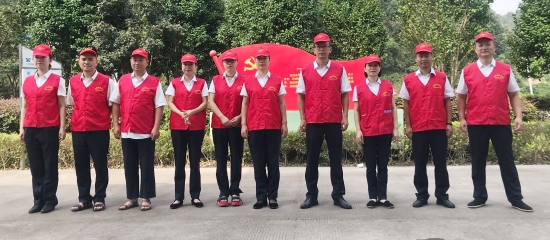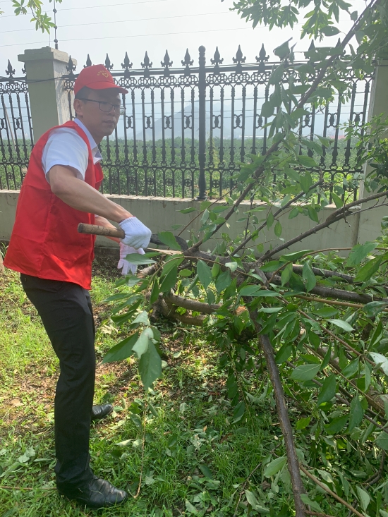 圖為志愿者合影 8月13日上午,該所志愿服務隊身穿統一紅色馬甲,積極投身到災后恢復工作中。 “把砍刀給我,我力氣大,讓我來。” 活動過程中,孫明偉、杜廣勝、楊堅等同志一行先查看了配電房周邊綠化帶,看到有樹木倒伏,壓在防護網上,存在較大安全隱患,他們二話不說立即手拿砍刀,對樹木進行切割處理,并由李學平、包德福等人安排拉車將斷木等清理干凈。