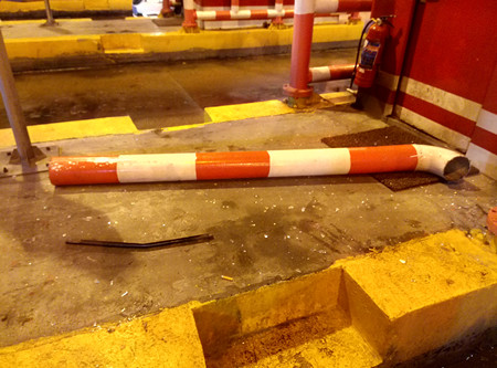 12月16日0:40分,一聲巨大響聲響徹臺州收費站夜空,一輛大型半掛貨車過站時,撞壞了收費崗亭的防撞鋼管和收費亭邊窗玻璃,所幸沒有造成人員受傷。
