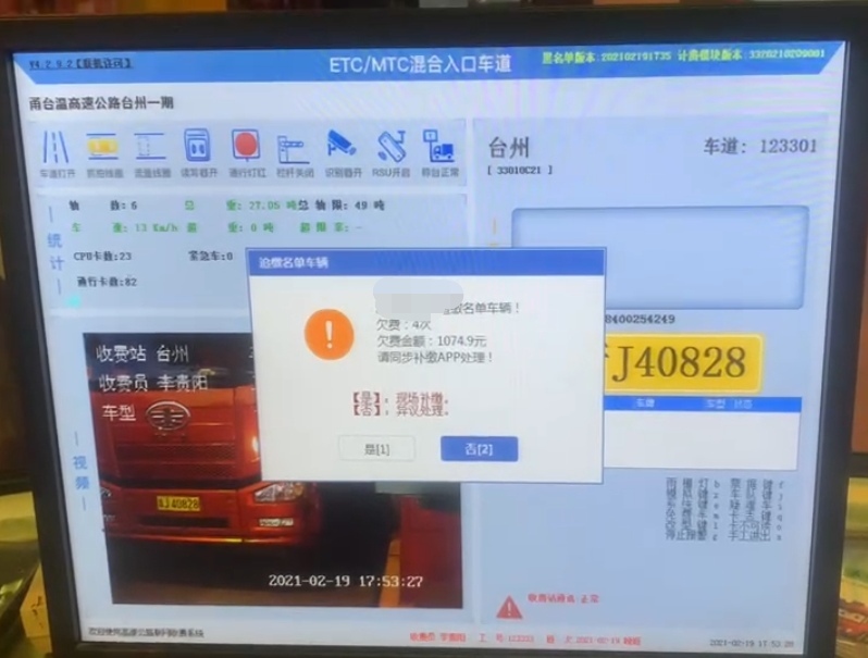 自取消省界收費(fèi)站全國(guó)高速公路聯(lián)網(wǎng)后,跨省追繳通行費(fèi)一直是個(gè)大難題,不少司機(jī)的省外通行費(fèi)因無(wú)法追繳,造成通行費(fèi)不斷流失。交通部為了適應(yīng)“全國(guó)一張網(wǎng)”稽核業(yè)務(wù)工作需要,確保各收費(fèi)站現(xiàn)場(chǎng)有序處理追繳名單車輛,避免造成社會(huì)輿情和人身財(cái)產(chǎn)安全事件,研發(fā)了全國(guó)稽核通行費(fèi)補(bǔ)費(fèi)系統(tǒng)。 2月19日晚17點(diǎn)50分左右,臺(tái)州收費(fèi)所進(jìn)口迎來(lái)一輛車牌為浙J開(kāi)頭的六類貨車,車道屏幕顯示為“浙J XXXXXX追繳名單車輛,欠費(fèi)4次,欠費(fèi)金額1074.9元,請(qǐng)同步補(bǔ)繳APP處理。”當(dāng)班收費(fèi)員見(jiàn)此詢問(wèn)駕駛員是否欠費(fèi),并喊來(lái)當(dāng)班班長(zhǎng)張錚過(guò)來(lái)處理。