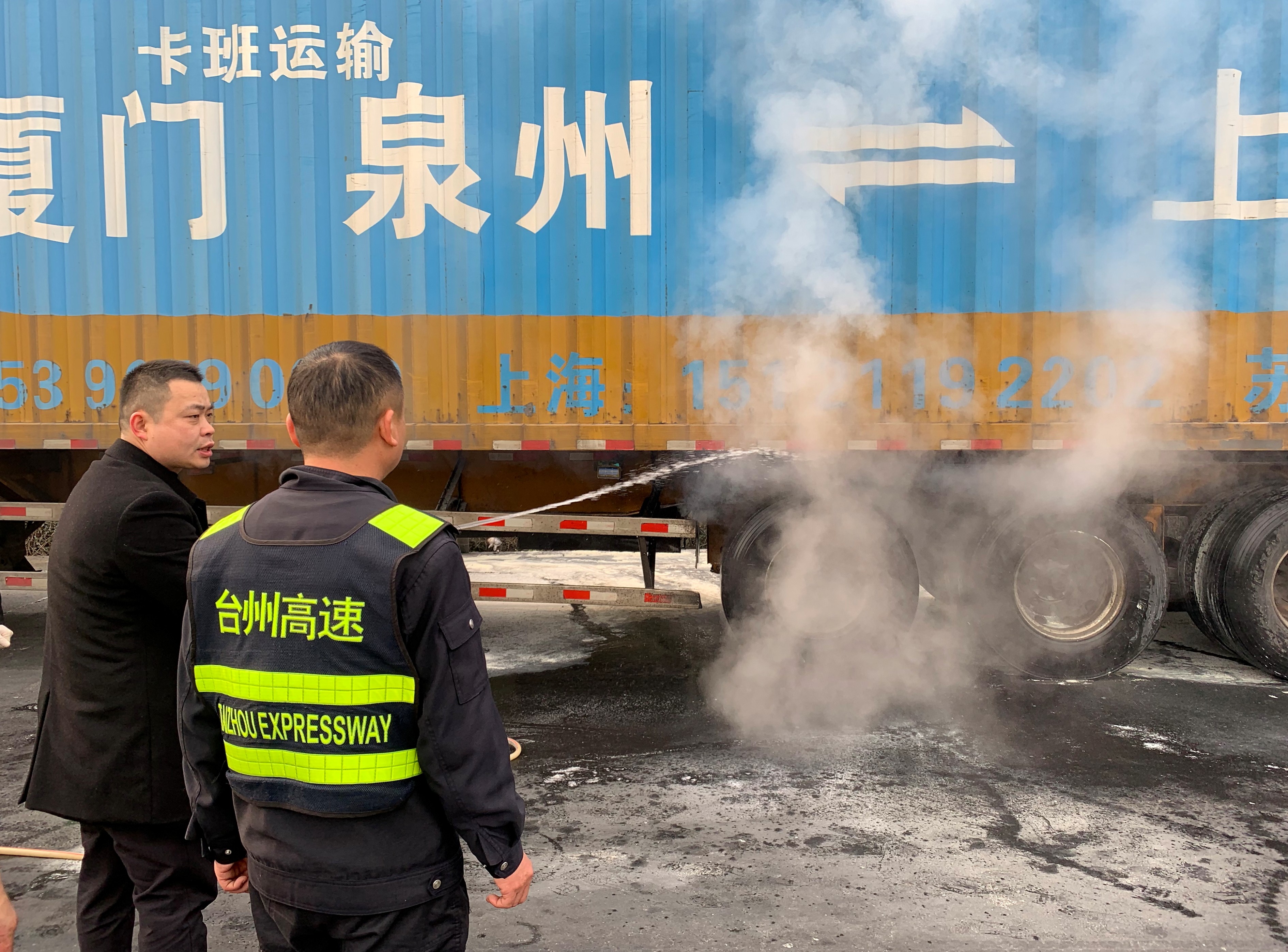 (圖為工作人員奮力救火) 就在這時,突然又一聲巨響, 貨車輪胎發生二次爆炸,火苗再次復燃。但大家絲毫不畏懼,提起滅火器對準著火點,快準狠,火苗再次被撲滅。現場,輪胎處還冒著白煙,監控中心何先林提議利用車道上的兩根水管的水對車輛輪胎進行沖水降溫,避免再次發生爆炸。 經過長達半小時的緊急救援,火勢終于得到控制,無人員傷亡,車輛也沒有造成損失。據了解,該車起火原因是輪胎上有鐵絲,摩擦產熱導致輪胎爆炸起火。 “太感謝了,全靠你們發現,及時止損,不然車就燒沒了?!瘪{駛員連聲道謝。 在此提醒廣大司乘人員,上高速前務必要對車輛進行全面檢查,特別是輪胎、剎車等重要部位,避免行車途中發生故障導致嚴重后果。 任青青