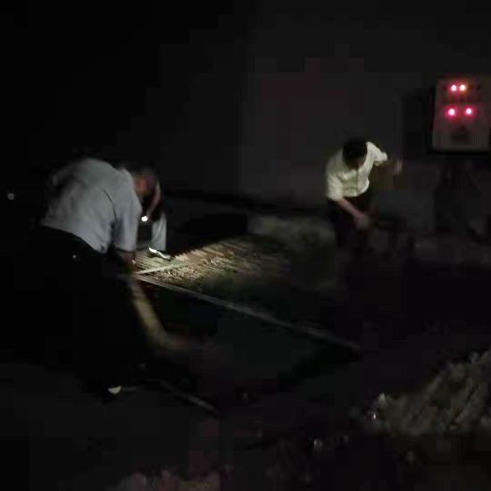 圖為車道水流 當晚19:12分,黃土嶺隧道所中控員徐彤霞發現寧向隧道主車道路面出現積水,如不及時處置,路面濕滑會讓過往車輛打滑,嚴重影響隧道的安全暢通。為了杜絕安全隱患,管理所立即啟動防汛應急方案,中控員第一時間在管理群發送現場圖片,并在同一時間通知執勤隊與監控中心。 執勤隊員不顧狂風暴雨趕赴現場,19:19分,斜井現場山上倒灌入隧道的水嘩嘩直流,儲水池水流急促,執勤隊員立即分工合作,一組在主車道擺放安全錐采取防護措施,并利用沙包,堵住排水溝壁,使水盡量不往外滲,及時避免了積水對隧道內行車造成的安全隱患。一組檢查潛水泵是否正常運行,查看積水入侵的原因、排水溝通暢情況。