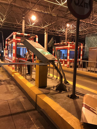 圖為被撞壞的ETC設備 當晚事故接連不斷。晚上22點40分,臺州收費所ETC進口處,一輛大客車行李車門撞歪顯示屏,同時也撞壞了一只抓拍攝像頭,造成了較大的路產損失,但是當班員工都正在路面上施救,施救中心領導統籌部署,通知兩位在所非當班人員赴崗上班,緊急出動,發揮連續作戰精神,進行及時處理。 當以上事故處理完畢,施救人員正準備往回趕的時候,當晚23點10分左右,四輛大貨車在寧向1667K+300M處連環追尾,其中一輛紅色大貨車車頭嚴重變形并且不斷向外漏油。現場極不安全,情況危急,施救中心員工馬不停蹄,又一次拉響了救援車的警報,為了爭取時間,甚至通知了另外地點待崗的人員火速趕來,以便能及早處理。此時,施救中心當班人員已經全體出動,全部戰斗在路上。 王凱