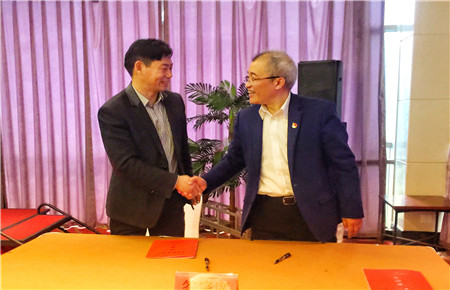 圖為集團(tuán)副總經(jīng)理陳保衛(wèi)與國資委主任徐豪簽訂責(zé)任書后握手