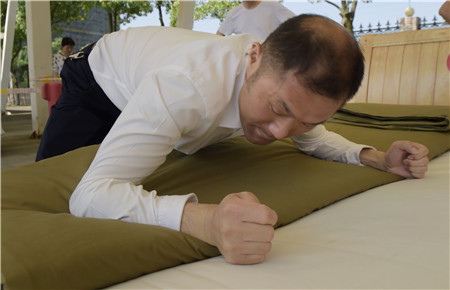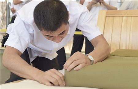 教官用手量量被子上下厚度,四周細細觀察,在兩床“豆腐塊”被子之間反復來回查看了幾遍,又與另一個教官指指點點商量了好久,不僅是參賽者,圍觀者都開始緊張了。確實,按照內務整理要求,這兩床已被疊成豆腐塊的被子折得有棱有角,被面光滑,上下勻稱,外行人看來就是一模一樣的完美,沒有任何區別了。“讓他們都晉級吧。”旁觀者說。教官笑著搖搖頭,對大家解釋道:“3號床勝出,因為它是雙面折法,在規定時間內兩面修整程度都一樣平整,這樣比起來,5號床稍遜一籌。”