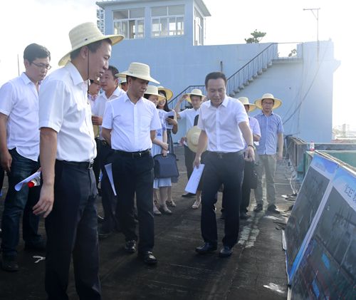 圖為臺州市副市長張加波實地察看海門港埠碼頭與新港區規劃建設用地 烈日下,調研組分別實地察看了海門港埠碼頭與新港區規劃建設用地。結合海門港埠總公司現狀用地區域圖及新碼頭選址方案圖展板,羅小將詳細介紹了港區碼頭目前區域現狀及新港區選址規劃設想方案,提出了港區剩余土地利用、建設項目規劃許可、新港區建設用地征遷安置等需要政府相關部門和椒江區政府大力支持的問題。