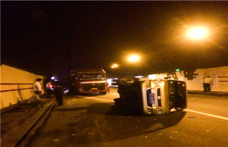 這輛“始作俑者”的車(chē)輛由于司機(jī)疲勞駕駛,不慎撞擊隧道壁而引發(fā)側(cè)翻,雖然該車(chē)內(nèi)無(wú)人員受傷,可是跟隨其后的拖掛車(chē)就沒(méi)那么幸運(yùn)。拖掛車(chē)司機(jī)看到前方出狀況,當(dāng)即采取緊急制動(dòng),剎得太急又致使后方小貨車(chē)追尾,導(dǎo)致該車(chē)車(chē)頭嚴(yán)重受損,司機(jī)的手臂受了傷,運(yùn)輸?shù)匿X塊也撒了一地。
