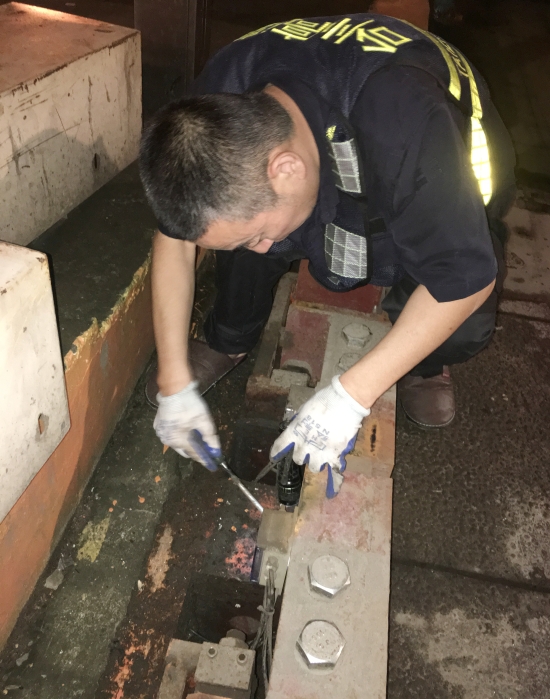 圖為張鵬在搶修計(jì)重稱臺(tái)