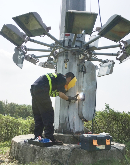 圖為張鵬在焊接被臺(tái)風(fēng)刮掉的高桿燈電箱門