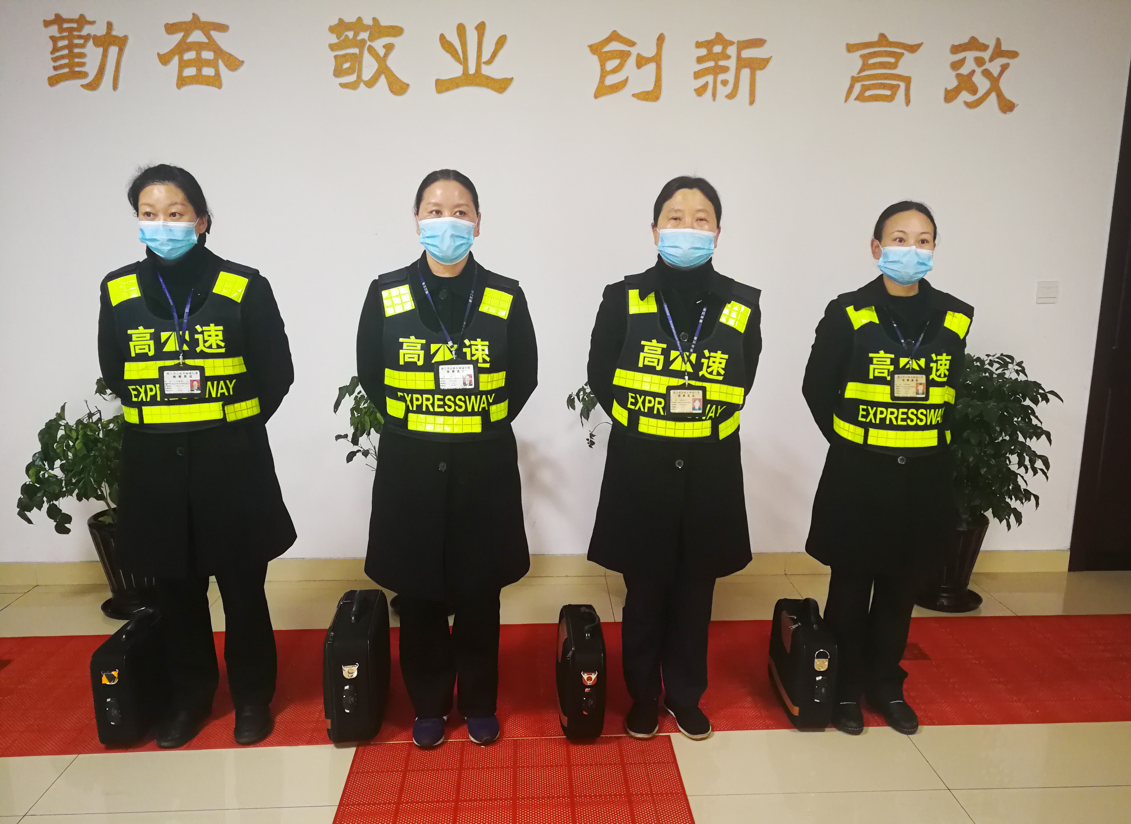 3月8日早上8點(diǎn)不到,孩子還未滿周歲的收費(fèi)員李菊麗穿好工作服,戴上口罩,在臨海南收費(fèi)所大廳和其他同事一起列隊(duì)等待上崗。這一班換崗恰巧全部輪到女同事,“今天是三八婦女節(jié),今天的崗?fù)と晃覀兣耍蠹乙黄饋碜龊梅酪吖ぷ鳎竞脥彛∵^好節(jié)。”李菊麗同隊(duì)友說道。
