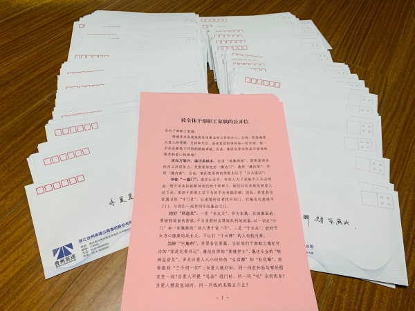 集團(tuán)開(kāi)展致全體干部職工家屬的公開(kāi)信活動(dòng) 6月18日,集團(tuán)緊貼廉政教育月活動(dòng)要求,將“致全體干部職工家屬的公開(kāi)信”交到每一名職工手中,以這種家書(shū)形式廣泛宣傳廉潔清正的重要性,呼吁他們爭(zhēng)當(dāng)反腐倡廉的“廉內(nèi)助”。